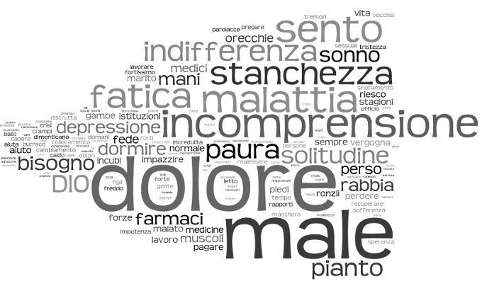 Vi sono molti modi di valutare il racconto di una storia di sofferenza e di dolore legati ad una malattia cronica implacabile. I descrittori che esprimono la sofferenza, il dolore, la rabbia, la paura, lo sconforto e le tante altre emozioni che spesso accompagnano chi è affetto da fibromialgia, sono infiniti e variegati. Uno dei modi per valutare il vissuto di malattia dei pazienti è quello di effettuare una analisi semantica basata sulla ricorrenza delle parole utilizzate dal paziente nella fase narrativa del dialogo.