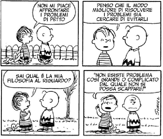 Quando temiamo le conseguenze di una decisione, o se non ci sentiamo sufficientemente competenti, o abbiamo il timore di sbagliare, ecco che la soluzione migliore diventa una non-soluzione. Ad esempio, ci chiediamo: “Che cosa succederebbe se non superassi l’esame all’università? O se non riuscissi a portare a termine quel compito come vuole il mio capo-ufficio? O se uscissi con quella persona e non sapessi cosa dire?” Più lo scenario che ci immaginiamo sarà catastrofico, più tenderemo a evitare le tragiche conseguenze che si disegnano nella nostra mente. Il motto di Linus è infatti un vero e proprio mantra per chi utilizza questa strategia come paradossale soluzione: non esiste problema che non possa essere evitato.