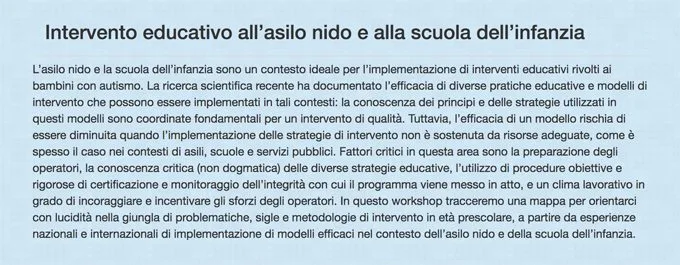 Lo scopo di questo workshop è proprio quello di offrire alcuni esempi di applicazione di alcuni modelli di trattamento per l’autismo sul territorio internazionale e nazionale.