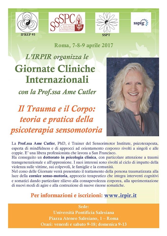 Nel corso di tre giornate di approfondimento organizzate dall’Istituto di Ricerca sui Processi Intrapsichici e Relazionali (IRPIR) e dalla Scuola Superiore di Specializzazione in Psicologia Clinica dell’Università Pontificia Salesiana (SSSPC-UPS), la dottoressa Ame Cutler, psicoterapeuta didatta del Sensorimotor Institute, ha presentato i capisaldi del trattamento della persona traumatizzata alla luce della psicoterapia sensomotoria; si tratta di un approccio terapeutico che utilizza il corpo come punto d’accesso ai disagi psicologici.