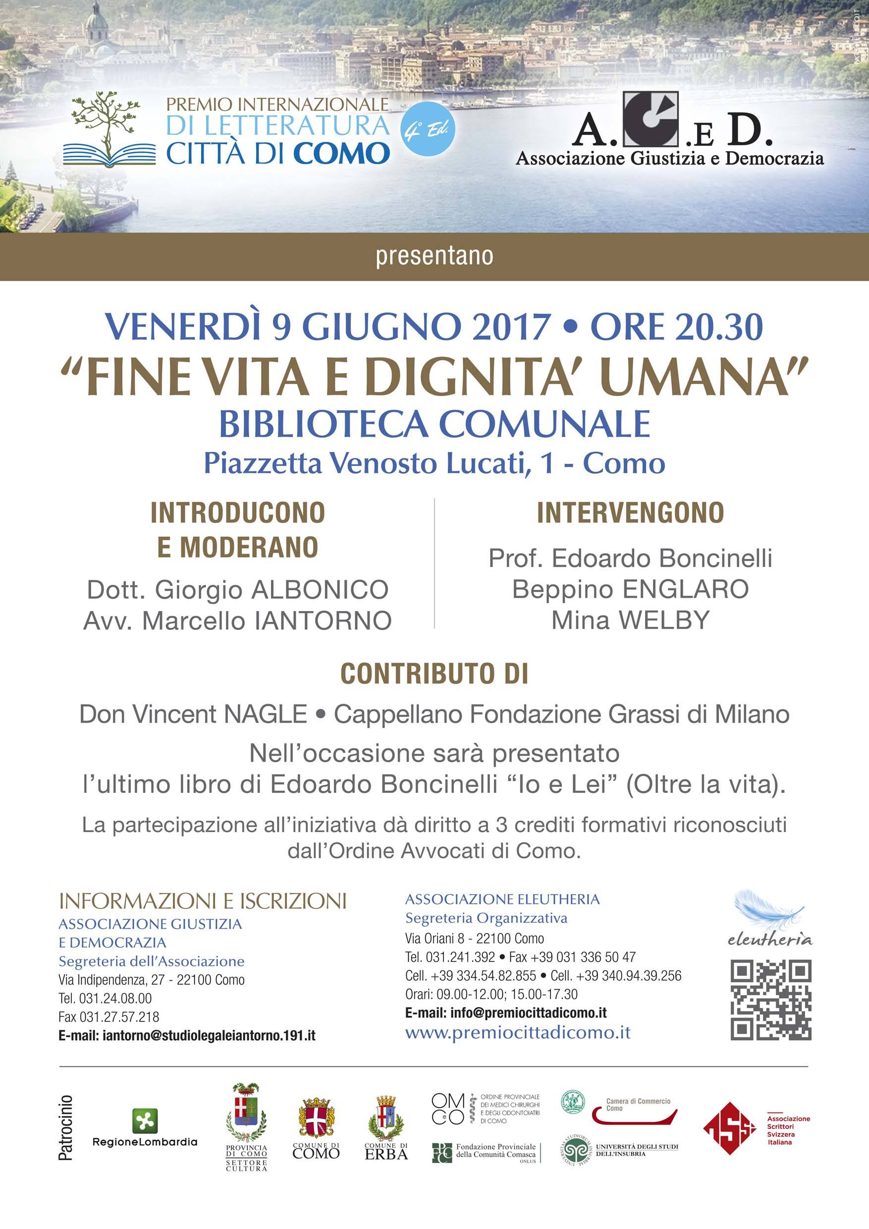 “Fine vita e dignità umana”. Saranno questi i temi al centro del nuovo incontro culturale organizzato nell’ambito del Premio Internazionale di Letteratura Città di Como in collaborazione con l’Associazione Giustizia e Democrazia (AGeD), che si terrà venerdì 9 giugno alle 20.30 presso la Biblioteca comunale di Como.