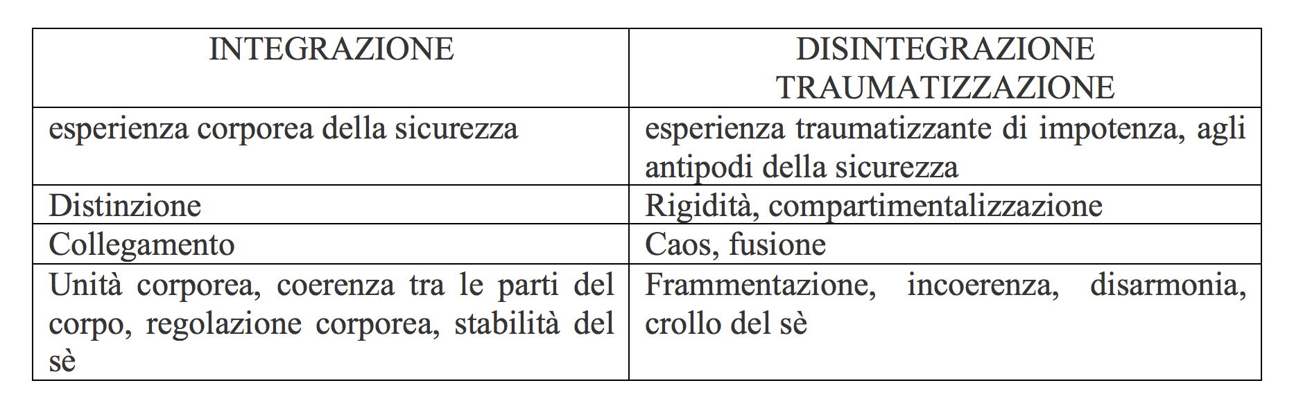 Il corpo sempre fa, sta, sa, ricorda e, al suo livello integrativo, distingue e collega. È un’area della personalità che non si può ridurre ad altro, poichè rappresenta la modalità primaria e immediata di fare esperienza, la base dello sviluppo psichico e del suo funzionamento per tutta la vita. Il senso di sè è incarnato nel corpo e le esperienze coscienti sono orientate in relazione al corpo.