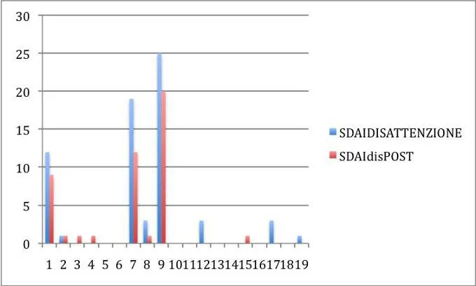 Fig. 1 In ascissa viene riportato il codice identificativo degli alunni e in ordinata i punteggi di disattenzione della scala SDAI pre e post.