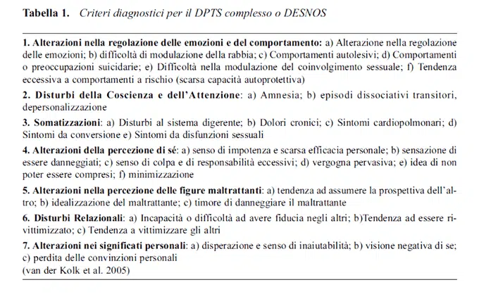 Nel tentativo di definire ed includere nella diagnosi l’eziologia di questo tipo di disturbi psicopatologici, questo cluster di sintomi è stato descritto altrove come Disturbo da Stress Post-traumatico Complesso (Herman, 1992) negli adulti o Developmental Trauma Disorder – Disturbo Traumatico dello Sviluppo (D’Andrea e Al., 2012; van der Kolk, 2005) nei bambini. Di seguito le caratteristiche identificate dagli autori: