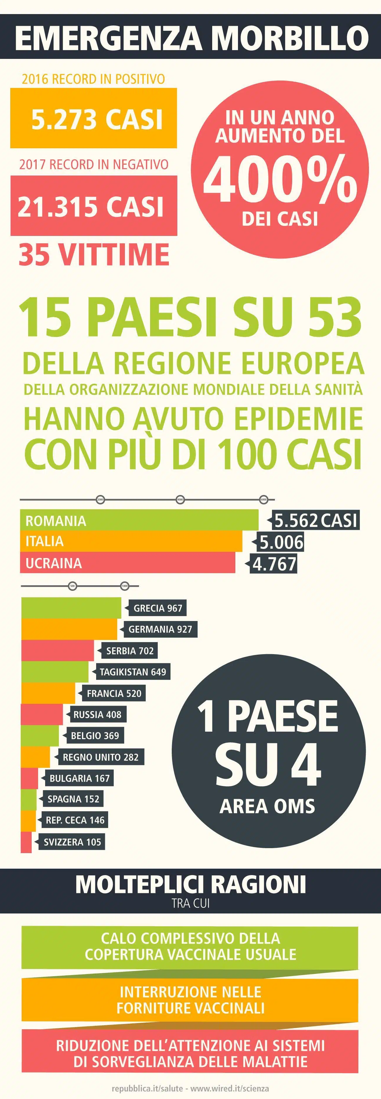 Basti aggiungere che ben 15 Paesi su 53 appartenenti alla regione europea hanno fatto registrare delle epidemie con più di cento casi. La situazione, insomma, appare tutt’altro che sotto controllo. L’infografica realizzata da Stampaprint Srl illustra tutti i dati riferiti a questo nuovo focolaio, ma non solo: l’Oms indica anche le probabili cause di quello che possiamo senza dubbio definire un inatteso e non gradito ritorno.