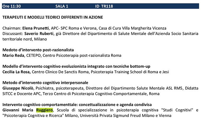 La prima giornata del XIX congresso nazionale della Società di Terapia Comportamentale e Cognitiva (SITCC) è stata un’occasione per confrontare i diversi orientamenti di vari esponenti della nostra società. Ho potuto ascoltare colleghi interessati alla mindfulness (Bassanini, D’Angerio, Donatella Fiore e Minniti), al modello metacognitivo interpersonale (Semerari, Carcione, Dimaggio e Nicolò), al modello post-razionalista (Mario Reda, Dodet, De Riso, Frassi, Fiori, Goretti, Mangini e Merigliano) e a quello cognitivo evoluzionista (Farina, Fassone, Ivaldi, Ruberti e Brasini).