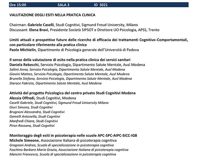 Accanto a queste presentazioni è stato poi interessante seguire le analisi sulla diffusione e l’applicabilità della psicoterapia cognitiva nel servizio pubblico e privato della professoressa Mirella Ruggeri in plenaria e del simposio di Gabriele Caselli, Bravi, Paolo Michielin, Alessia Offredi, Daniela Rebecchi, e Michele Simeone. Il nocciolo di questa esperienza è sempre la dialettica tra bisogno di formalizzare gli interventi in procedure controllabili e replicabili e rischi di forzature artificiali, insomma la dialettica tra evidenze based practice e practice based evidence.