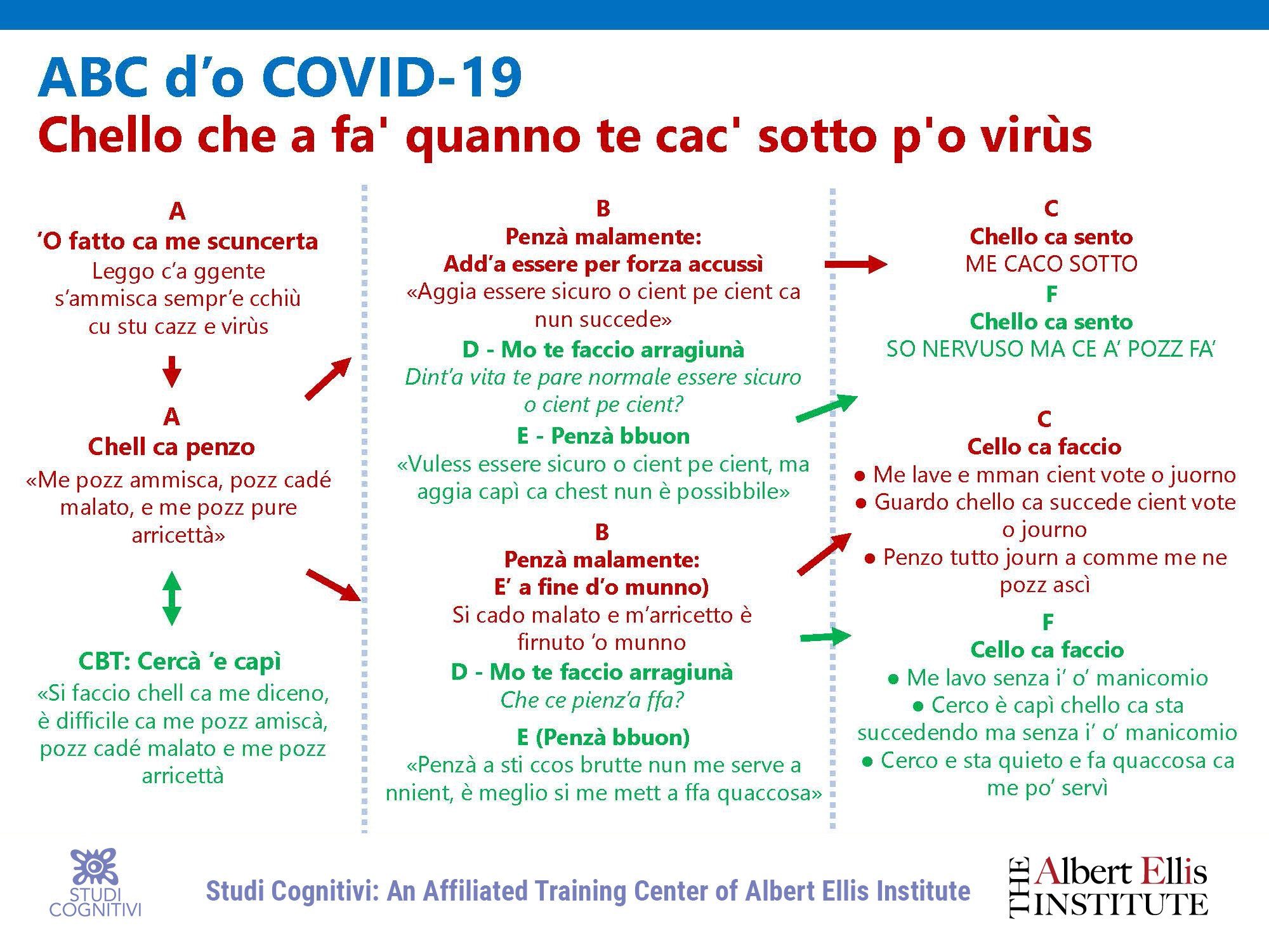 Tradurre in dialetto napoletano l’ABC -come ha fatto il collega Diego Sarracino- ha le sue difficoltà ma anche i suoi vantaggi. L’ABC, come alcuni sanno, è uno strumento di valutazione dei pensieri disfunzionali, quelli che non ci aiutano ad affrontare le situazioni e che ci fanno stare male.