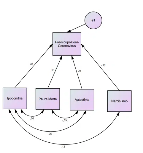 Figura 1. Modello definito con i quattro Predittori studiati (Ipocondria, Paura Morte, Autostima e Narcisismo) e l’influenza (su valori standardizzati) della variabile dipendente Preoccupazione per il Coronavirus