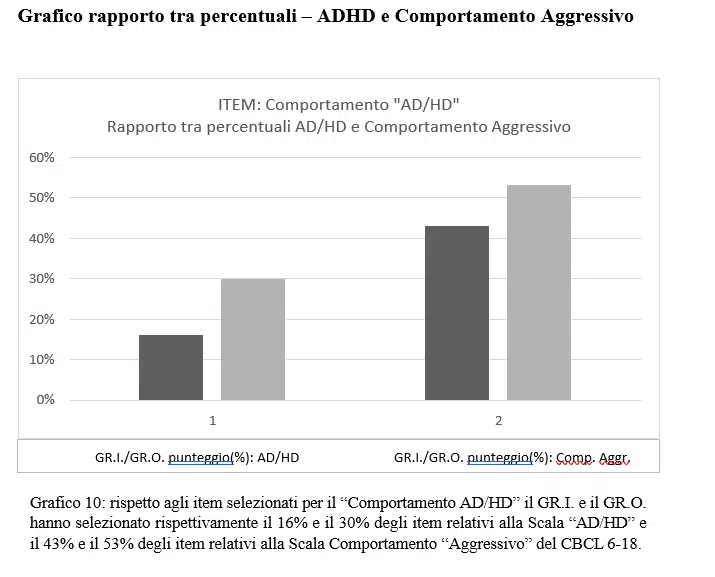 Per quanto riguarda gli item relativi a “comportamento AD/HD” abbiamo riscontrato che la maggior parte degli item inseriti tra quelli che si riferiscono a “comportamento AD/HD” sono quelli che fanno riferimento alla Scala del “Comportamento Aggressivo”. GR.I. 43%, GR.O. 53%. Mentre degli item relativi alla Scala “AD/HD” sono stati scelti il 16% dal GR.I. e il 30% dal GR.O.