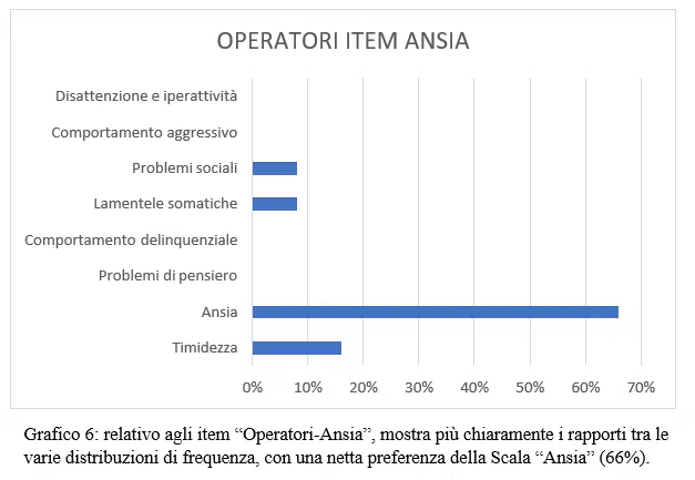 Nella performance sugli “item-ansia” il Gruppo Insegnanti per un terzo riporta un punteggio una dev. st. sotto la media (s= -1), 2 su 14 sopra la media (s= 1) e la metà restante nella media (s= 0). Scenario diverso quello degli operatori, per cui, un terzo presenta un punteggio una dev. st. sopra la media (s= 1) 2 su 14 sotto la media (s= -1) e la metà restante nella media (s= 0).
