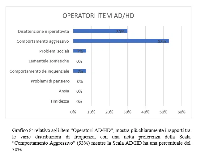 Tuttavia, dalle valutazioni fatte, emergono dati su cui riflettere, sia nel caso dell’interpretazione del “Comportamento Ansioso” che del “Comportamento AD/HD”. La Scala “Ansia” non ha avuto, in entrambi i casi, un punteggio pieno (30% Insegnanti; 66% Operatori) inoltre tra gli item-ansia del GR.I. vi è una presenza paritaria della Scala Ansia e della Scala Timidezza. Soprattutto in merito alla sintomatologia relativa all’AD/HD, in entrambi i casi, si evince una certa confusione di interpretazione del “Comportamento AD/HD” (16% Insegnanti; 30% Operatori) inteso da entrambi i gruppi come “Comportamento Aggressivo” (43% Insegnanti; 53% Operatori).