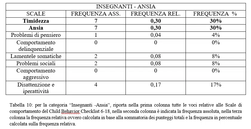 Da quanto si evince i seguenti dati in ordine decrescente: Scala “Timidezza” e Scala “Ansia” (30%); “Disattenzione e Iperattività” (17%); Scale “Lamentele Somatiche” e “Problemi Sociali” (8%); Scala “Problemi di Pensiero” (4%); Scale “Comportamento Delinquenziale” “Comportamento Aggressivo” (0%).