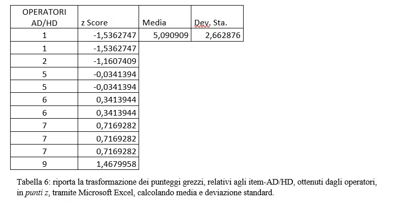 Nella performance sugli Item AD/HD il gruppo insegnanti per due terzi riporta un punteggio una dev. st. nella media (s= 0), e un terzo al di sopra della media (s= 1). Discorso diverso per gli operatori per cui, un terzo presenta un punteggio una dev. st. sotto la media (s= -1) due terzi nella media (s= 0).