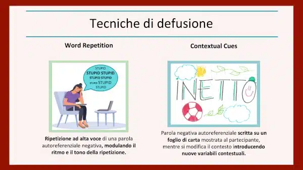 Rispetto alla defusione, la dott.ssa Oppo ha poi messo in luce un problema di termini: la defusione non deve essere intesa come una tecnica, bensì come un esito perseguibile attraverso processi di base diversi (Assaz et al., 2018). Ed è da questo razionale che è nato lo studio sperimentale esposto successivamente, che riguardava l’efficacia di due differenti tecniche di defusione cognitiva (vedi Figura 1):