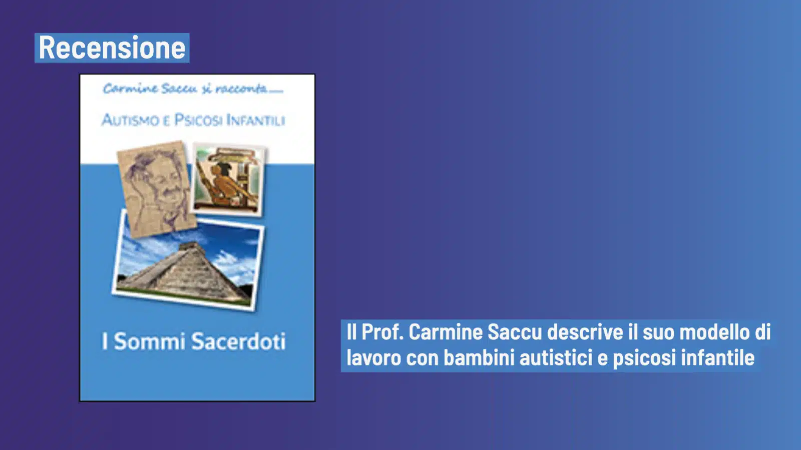 Il volume “I sommi sacerdoti. Autismo e Psicosi infantili” presentato di recente al Convegno organizzato per festeggiare i 30 anni di attività della Scuola di formazione di cui Saccu è direttore, rappresenta la seconda parte della narrazione scritta, in cui l’autore racconta la propria vita, mescolando fantasia, episodi biografici, documentazione dell’attività clinica, dando ampio spazio al suo pensiero e al suo modello.