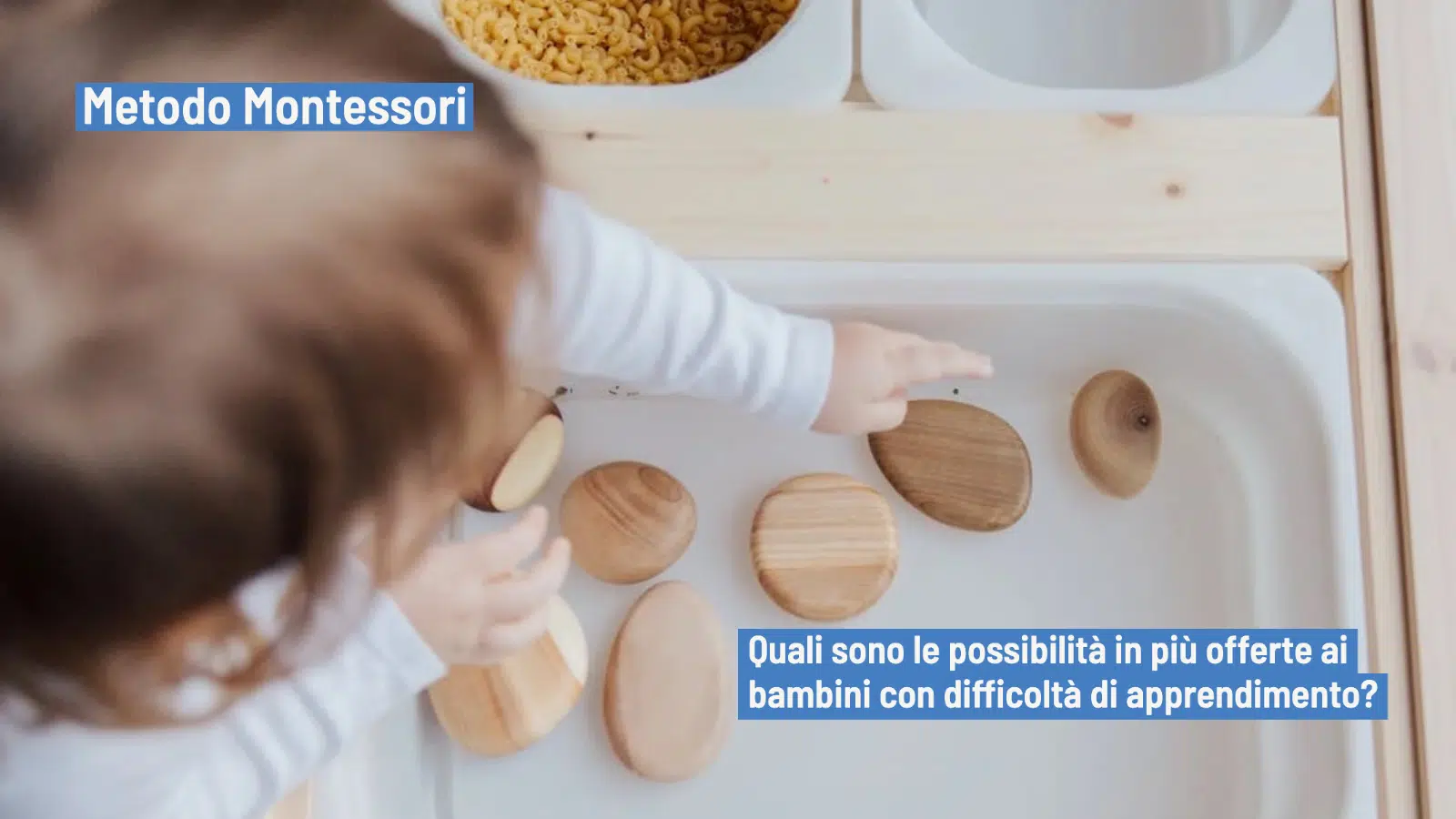 In definitiva, per chi si occupa di bambini che apprendono in modo diverso, il metodo Montessori offre molte possibilità, soddisfacendo le esigenze dei disturbi dell’apprendimento nel linguaggio, nella matematica, nella letto-scrittura, nella memoria, nell’attenzione e nella motricità (Drigas & Gkeka, 2017). Tuttavia, questo metodo non può essere considerato una risposta completa (Orem, 1969): per utilizzarlo con bambini con difficoltà di apprendimento è necessario, infatti, che il materiale venga integrato con altri materiali progettati specificatamente per bambini con queste difficoltà (Orem, 1969; Orem & Coburn, 1978; Pickering, 2004).