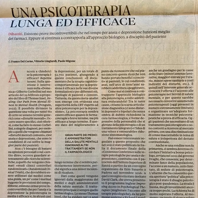 Ringraziamo Franco Del Corno, Vittorio Lingiardi e Paolo Migone che il 9 aprile 2023 sul Sole 24 Ore hanno risposto all’intervento di Gilberto Corbellini del 29 febbraio ribadendo l’efficacia delle psicoterapie: “esistono ormai prove incontrovertibili che per l’ansia e la depressione la psicoterapia in media è efficace e, in alcuni casi – anche se la contrapposizione è insensata – più dei farmaci”.