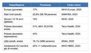La Polonia presenta la situazione più critica tra i lavoratori europei. I dati del Mental Health Index di Telus Health 2024 sono devastanti: la Polonia registra il punteggio più basso in Europa (55,5 su 100), con il 43% dei lavoratori che dichiara di soffrire di depressione e il 51% di ansia (Telus Health, 2024). Questi dati collocano il paese in una categoria di “strain” che indica un rischio significativamente elevato per la salute mentale della forza lavoro.