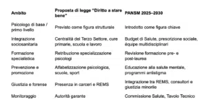 La proposta di legge promossa dalla campagna “Diritto a stare bene” prevede un investimento strutturale da 3,3 miliardi di euro annui per la creazione di una rete psicologica pubblica, capillare e integrata. I principali assi di intervento includono: