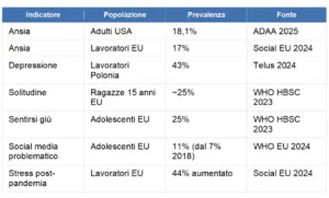 La pandemia COVID-19 ha lasciato un’eredità duratura: il 44% dei lavoratori europei riporta stress aumentato, il 38% è ad alto rischio di cattiva salute mentale. Nel frattempo, l’uso problematico dei social media tra gli adolescenti è cresciuto del 57% in quattro anni (dal 7% all’11%), e la solitudine è riconosciuta dall’OMS come una minaccia globale comparabile al fumo.