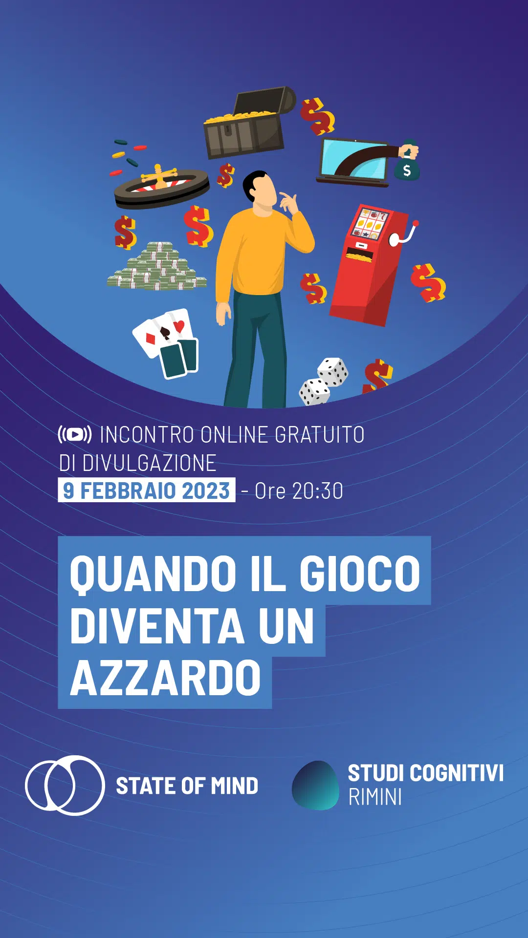 State of Mind, in collaborazione con Centro Clinico Studi Cognitivi Rimini, presenta “I giovedì dell’approfondimento”, un ciclo di incontri online gratuiti di divulgazione rivolti al pubblico. Il fenomeno del gioco d’azzardo in Italia è in continua espansione e la sua pratica può portare allo sviluppo di una vera e propria dipendenza comportamentale, con comportamenti a rischio e agiti impulsivi. Ma qual è il confine tra gioco sociale e gioco patologico? Quando chiedere aiuto? Vedremo insieme quali sono i fattori di rischio, i meccanismi che sostengono e favoriscono la dipendenza, le conseguenze ad essa più spesso associate e alcune strategie per promuovere l'astinenza. L'ottavo giovedì del ciclo sarà dedicato al gioco d'azzardo. Appuntamento al 09 Febbraio 2023, alle ore 20:30. L’evento è gratuito, per parteciparvi è necessario iscriversi. [gravityform id="36" title="true" description="true"]