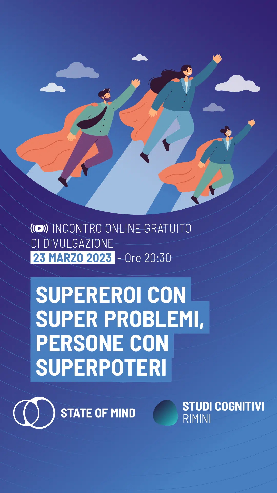 State of Mind, in collaborazione con Centro Clinico Studi Cognitivi Rimini, presenta “I giovedì dell’approfondimento”, un ciclo di incontri online gratuiti di divulgazione rivolti al pubblico. Supereroi: esseri con incredibili super poteri che senza paura sconfiggono i mostri e aiutano le persone. Tanto tempo fa…forse non così tanto, i supereroi dei fumetti erano visti in maniera negativa, complici di promuovere la delinquenza giovanile. Erano gli anni 50, prima che arrivasse Stan Lee a stravolgere il concetto di supereroe. Spiderman, Ironman, Hulk ecc.. oltre ai super mostri che minacciano di distruggere il pianeta devono fronteggiare anche i loro mostri, fatti di pensieri ed emozioni. Prendendo come esempio gli eroi Marvel dei film, nel corso dell’incontro vedremo quali superpoteri possiamo mettere in campo per affrontare i nostri mostri. L'undicesimo giovedì del ciclo sarà dedicato ai supereroi e i loro super problemi. Appuntamento al 23 Marzo 2023, alle ore 20:30. L’evento è gratuito, per parteciparvi è necessario iscriversi. [gravityform id="39" title="true" description="true"]