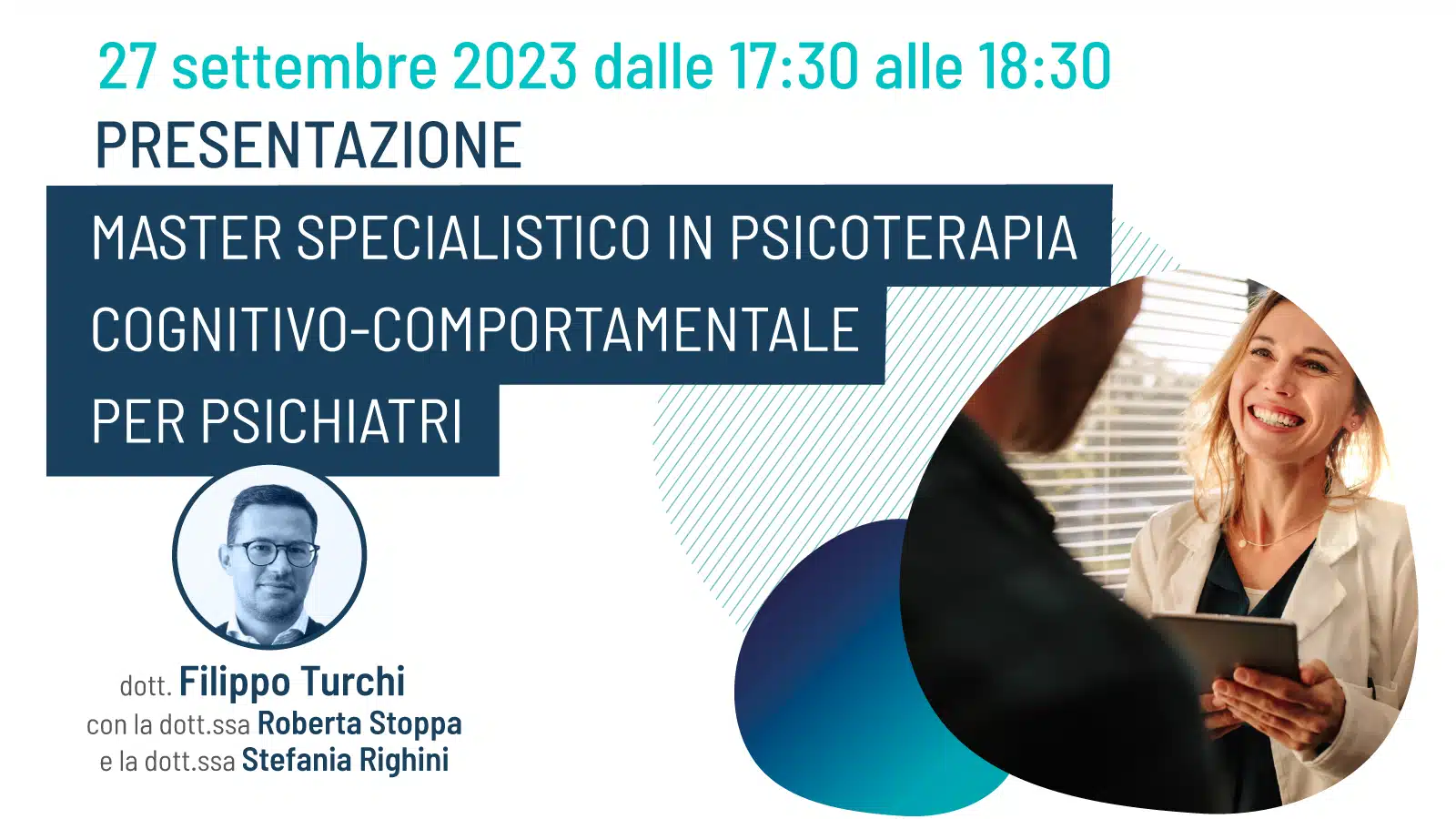 Mercoledì 27 settembre 2023 dalle 17.30 alle 18.30 il dott. Filippo Turchi, psichiatra e psicoterapeuta cognitivo-comportamentale, presenterà il master, il progetto didattico, gli insegnamenti previsti e gli obiettivi di apprendimento.