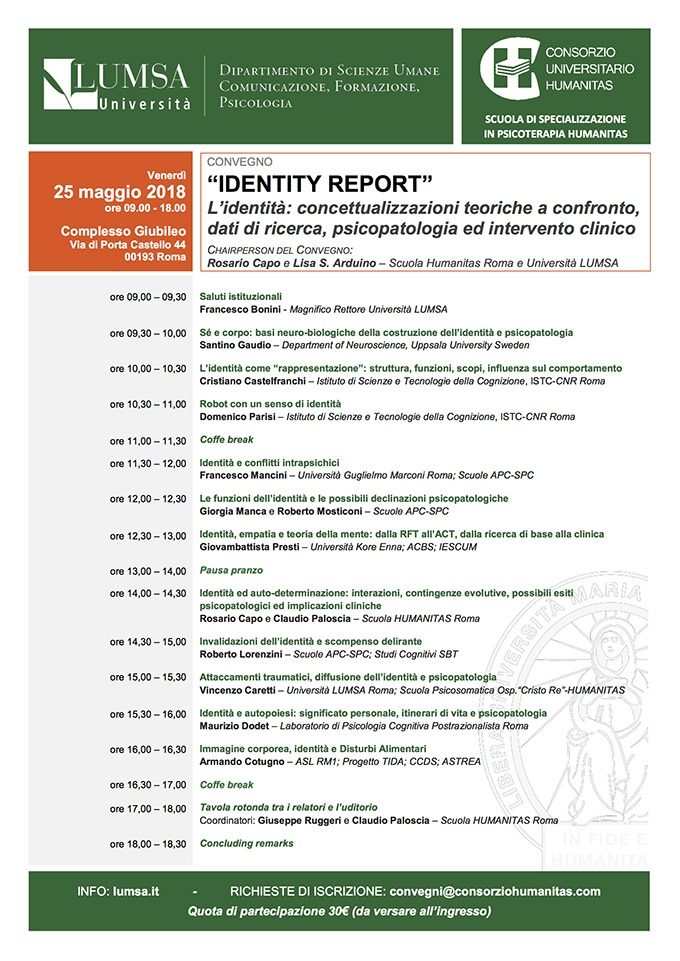 Il Dipartimento di Scienze umane e la Scuola di specializzazione in Psicoterapia – Humanitas organizzano il convegno “Identity Report” - L’identità: concettualizzazioni teoriche a confronto, dati di ricerca, psicopatologia ed intervento clinico in programma nell’Aula Magna il 25 maggio 2018.
