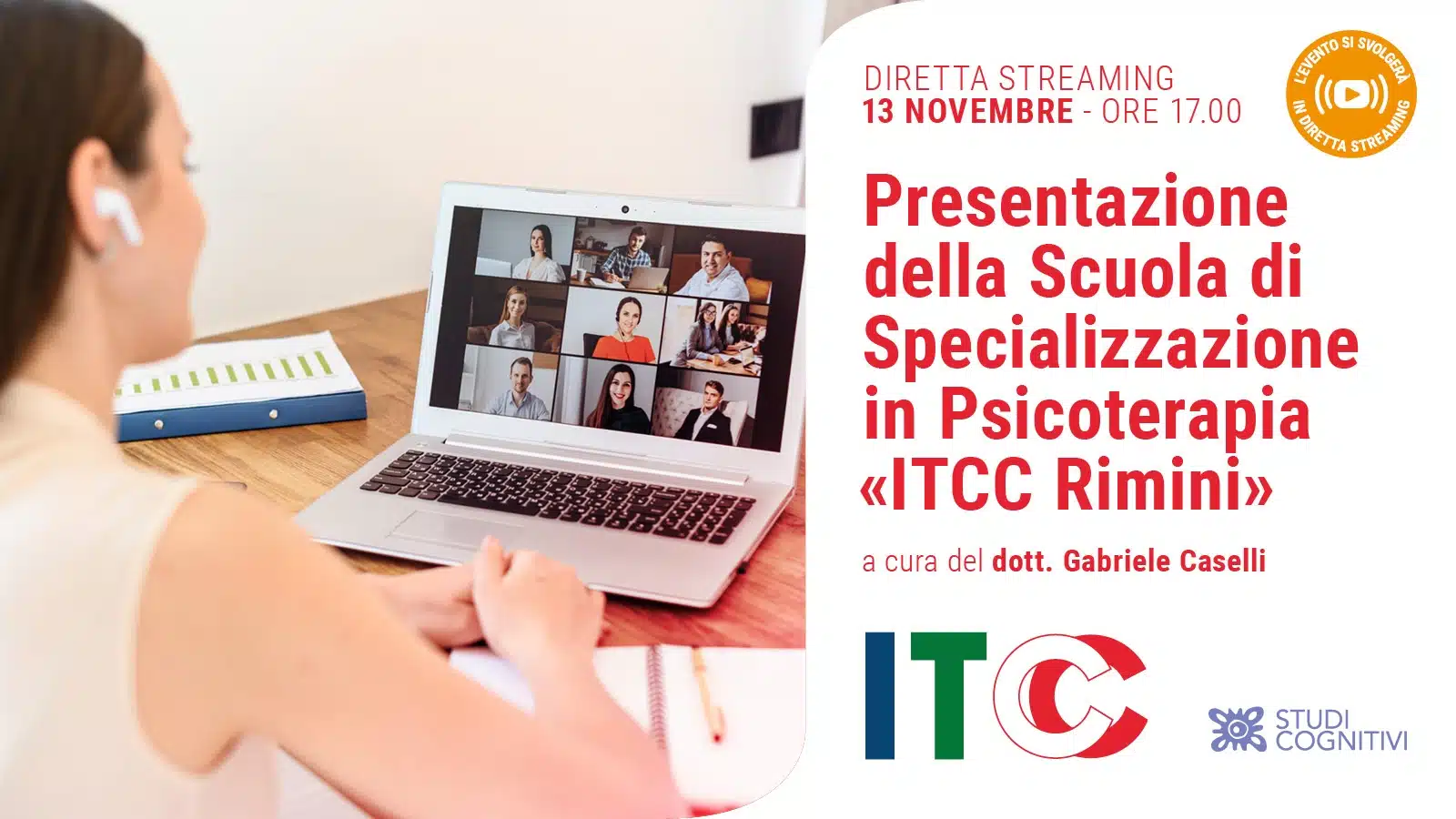 Il giorno 13 novembre 2020 alle ore 17 il Dott. Gabriele Caselli presenterà il Corso di Specializzazione in Psicoterapia Cognitivo Comportamentale. Introduzione agli allievi della nuova proposta didattica frutto della collaborazione fra ITC e Studi Cognitivi. Questo nuovo progetto mira a integrare i punti di forza delle due tradizioni formative. Tiene vive le competenze cliniche nella tradizione cognitiva comportamentale dell’ITCC, come ad esempio il training di assertività, di rilassamento, l’esposizione e le tecniche comportamentali, l’esposizione e l’intervento sull’autoefficacia, e le integra con gli insegnamenti tipici derivanti dall’esperienza didattica di Studi Cognitivi, come le tecniche cognitiviste di disputa di Albert Ellis, le tecniche di questioning di Aaron Beck, le tecniche base della terapia metacognitiva di Adrian Wells oltre a modelli terapeutici di terza generazione e al modello di intervento LIBET che analizza le sensibilità personali apprese nelle storie di vita e i conseguenti piani disfunzionali. La presentazione avrà inizio alle ore 17 e si terrà in diretta streaming. L'evento è gratuito ma è necessario iscriversi compilando l’ apposito modulo online.